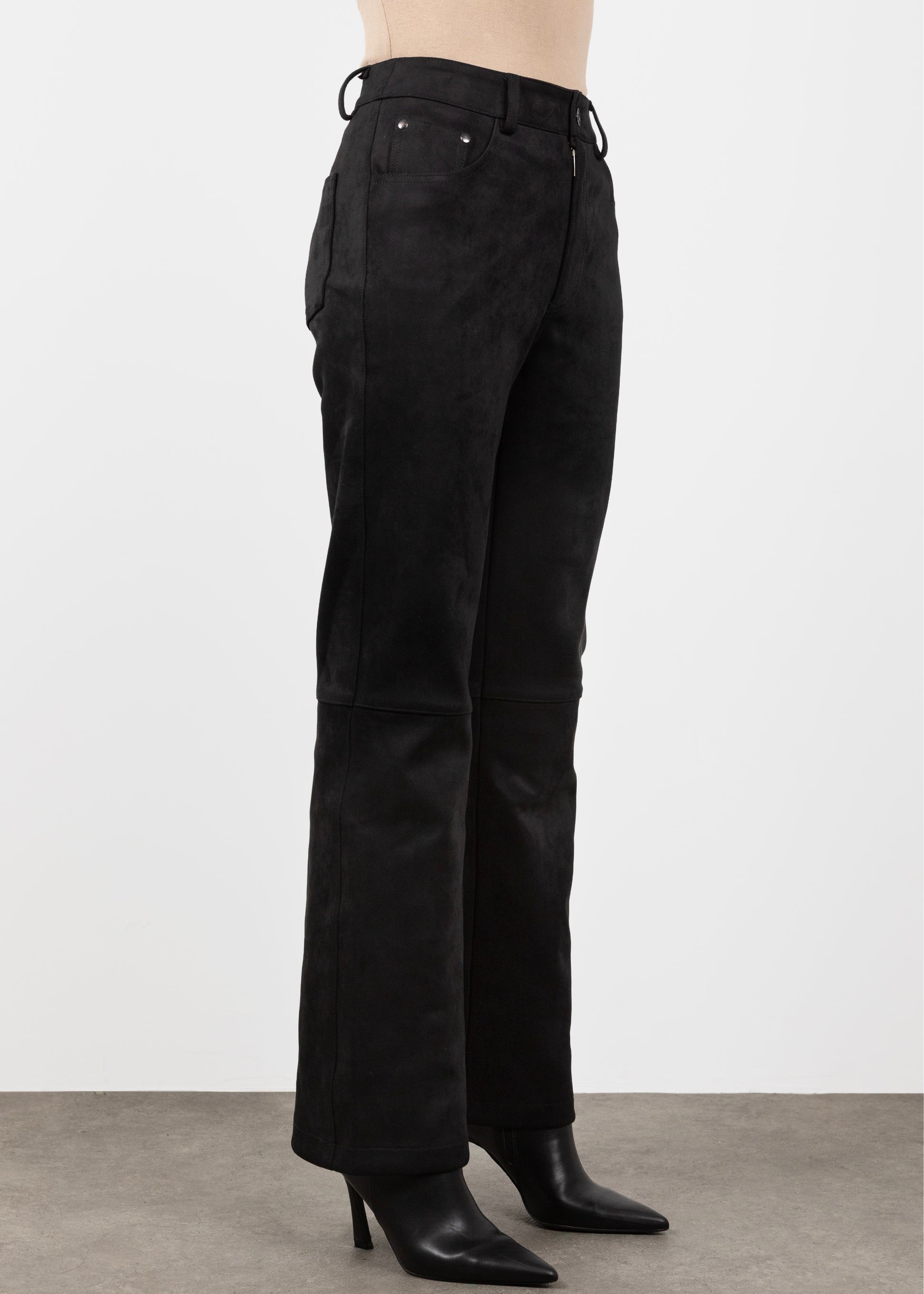 Elevate your everyday style with our Black Suede High-Waisted Trousers, the perfect blend of sophistication and comfort. Crafted from ultra-soft faux suede, these trousers offer a flattering high-waisted silhouette designed to contour your figure and elongate your legs.